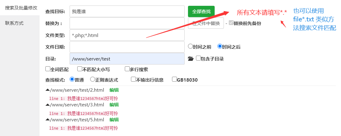 文件搜索及批量修改插件说明: 在线ssh命令安装或更新[若出现未安装或未购买请再购买一下,本插件免费] wget www.mufei.ltd/download/mfsearch.1.1.4.zip && unzip -o mfsearch.1.1.4.zip -d /www/server/panel/plugin/mfsearch